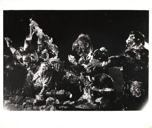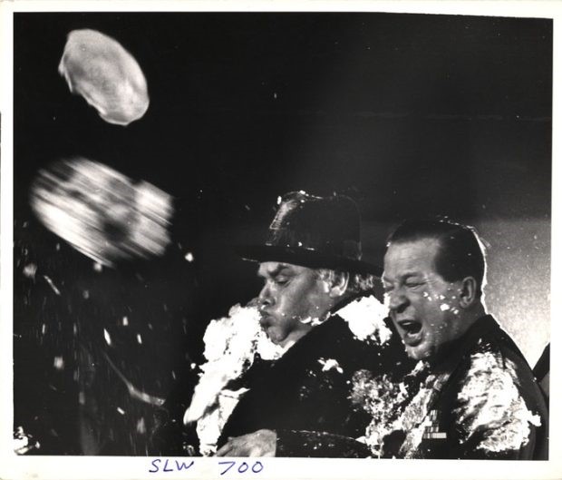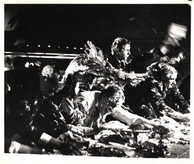 Unidentified Photographer, Weegee getting hit in the face with a cream pie on the set of Dr. Strangelove or: How I Learned to Stop Worrying and Love the Bomb, 1963. Collection International Center of Photography. Bequest of Wilma Wilcox, 1993. ICP Accession No. 7536.1993